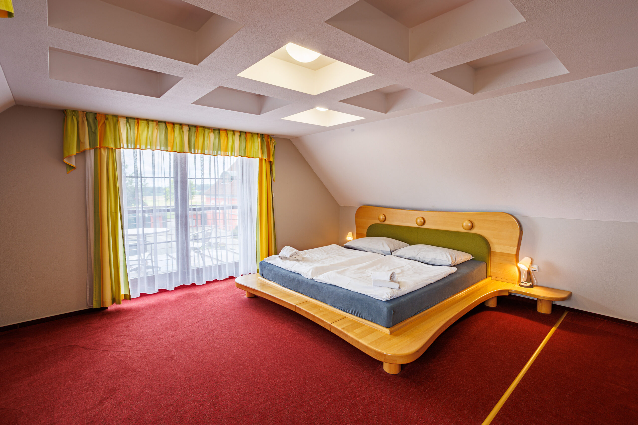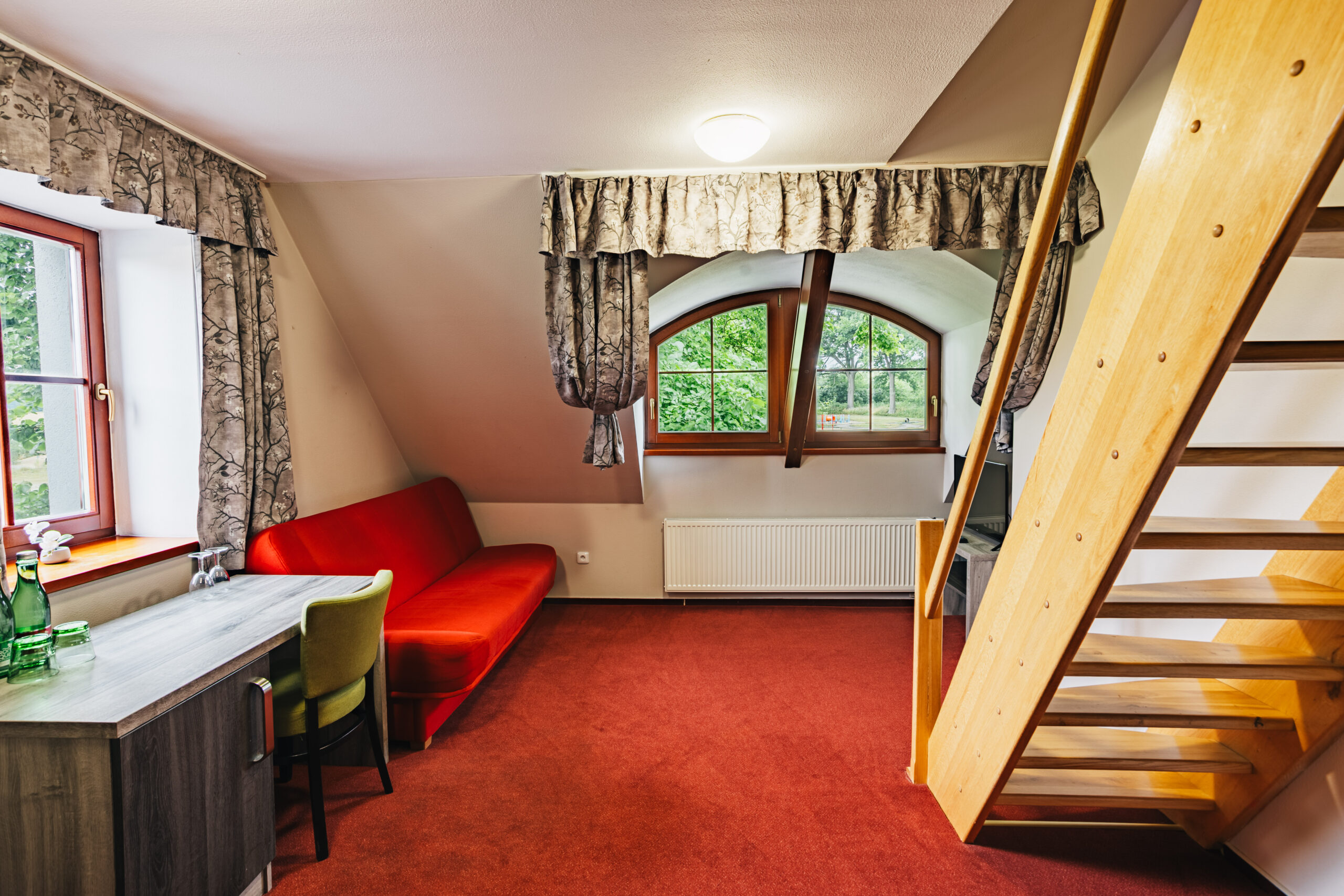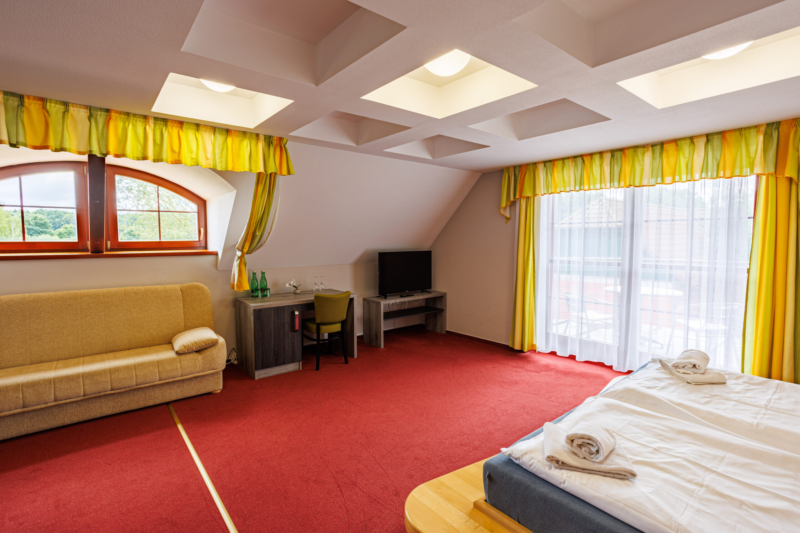 Císařský apartmán je oblíbený pro rodiny i páry. K dispozici jsou 2 pevná lůžka a 1 přistýlka. Je zde sprcha i vana.